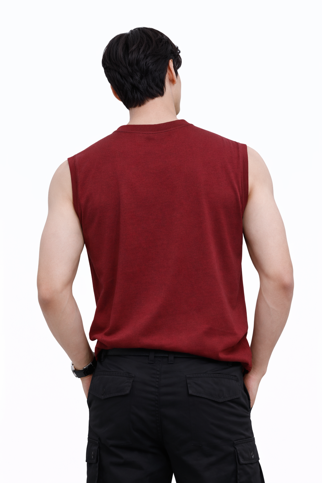 maroon sleeveless t-shirt