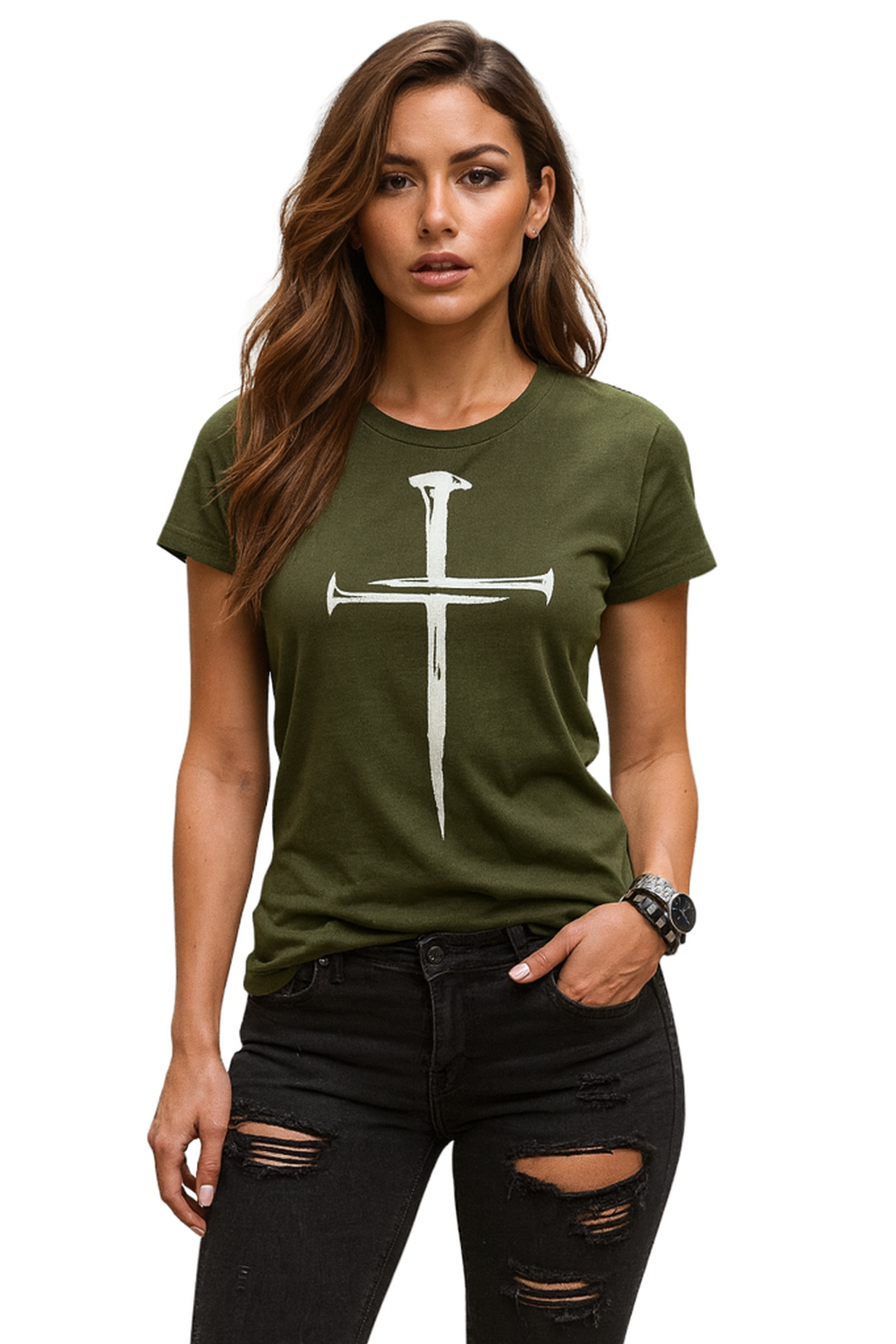 Make a bold yet meaningful style statement with this women’s olive green graphic T-shirt. Designed with a striking minimalist cross formed by nail elements, this tee blends faith-inspired symbolism with modern fashion. Crafted from soft, breathable fabric, it offers a comfortable regular fit that’s perfect for everyday wear. Pair it with jeans or casual bottoms for an effortless, confident look that stands out while staying understated.